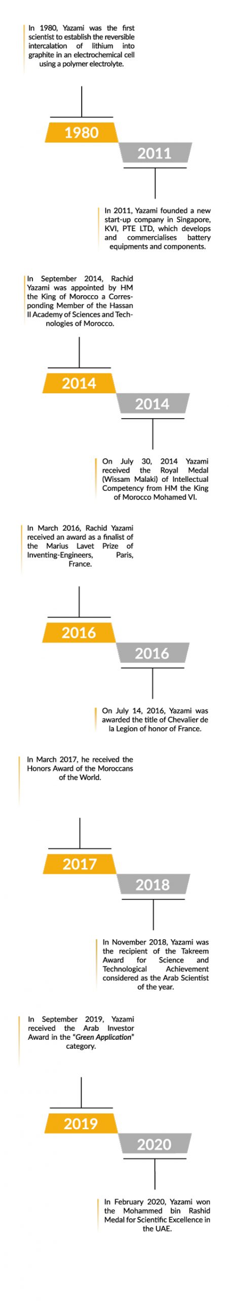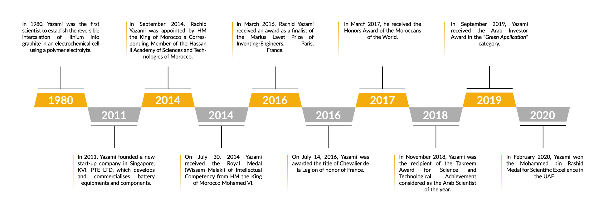 Yazami is the recipient of several research awards, including NATO (Science for Peace Award), NASA (two Technical Innovation Awards), IBA (Research Award), and the Hawaii Battery Conference. He is the main Founder of CFX Battery, Inc. (now Contour Energy Systems, Inc.) a Caltech-CNRS start-up company in Azusa, California and of KVI PTE LTD in Singapore. Yazami is the winner of 2012 Institute of Electrical and Electronics Engineers IEEE Medal for Environmental and Safety Technologies.